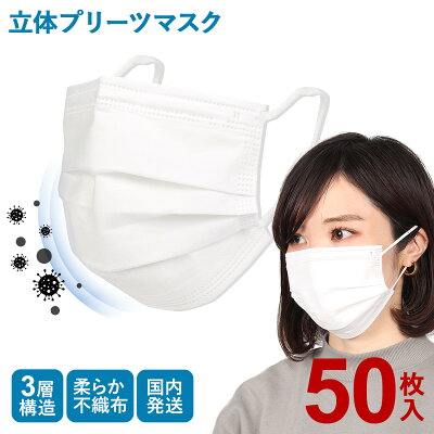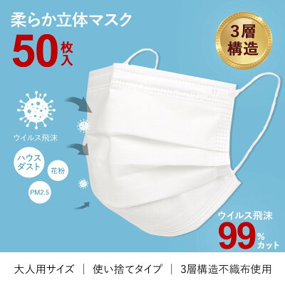 【最大2000円OFFクーポン】 マスク 50枚 不織布 セット 99%カット 衛生 使い捨て 三層構造 大人用サイズ ウイルス 花粉 防塵 飛沫感染 PM2.5 風邪 ハウスダスト 男女兼用 箱 衛生用品 立体 プリーツ ホワイト 白 【予約 4/21 随時発送予定】【返品不可】